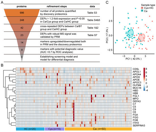 Biomarkers validation by targeted proteomics. (A) The funnel diagram illustrates the main processes of narrowing the potential candidates and, finally, establishing a diagnostic model. The orange funnel-shaped picture in the left column represents the process of step-by-step screening of protein candidates, and the numbers inside represent the number of proteins in each step. The middle column represents the performed screening conditions, and the right column represents the corresponding data tables. (B) Heatmap of relative abundance of 14 candidate proteins using PRM approach. Colored red represents an increasing trend, colored blue represents a decreasing trend, and the right scale bar represents the fold change of the relative quantitation data. (C) PCA plot based on the quantification of 14 proteins based on PRM. The multi-dimensional variables are reduced by the statistical method of PCA and converted into two-dimensional variables with high precision.