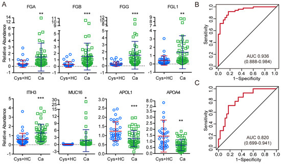Development of a protein panel for liquid biopsy of ovarian cancer. (A) Scatter plots of quantitative comparisons between the Ca group and the HC/Cys group for indicators with potential diagnostic value for ovarian cancer. The blue circles represent relative quantification values for cystadenomas and healthy controls. Green boxes represent relative quantification values for ovarian cancer patients. * p < 0.05, ** p < 0.01, *** p < 0.001. (B) ROC analysis of the novel model to diagnose ovarian cancer in a general population. Multivariate logistic regression analysis was performed in all patients to establish a screening diagnostic model followed by receiver operating curve analysis. (C) ROC analysis of the novel diagnostic model to diagnose early-stage ovarian cancer.