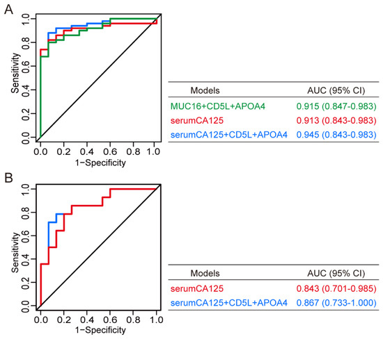 When an ovarian tumor presents some ambiguous characteristics, the differential diagnosis between cystadenoma and ovarian cancer is essential for therapy. In ROC analysis, eight protein candidates (FGB, FGG, FGL1, MUC16, MPO, APOL1, APOA4, and CD5L) with AUC > 0.65 were subjected to univariate logistic regression analysis. Then, we selected six parameters (FGB, FGG, MUC16, APOL1, APOA4, and CD5L) based on the statistical p-value and our experience (Tables S10 and S11) for the subsequent multivariate logistic regression analysis. We used the stepwise (LR) method as described before to establish a novel model for accurately identifying ovarian cancer in the presence of a definite ovarian mass suspected to be ovarian cancer or ovarian cystadenoma. Finally, a diagnostic model comprising three proteins (MUC16, APOA4, and CD5L) was developed (Figure 7A and Table 7). The diagnostic equation was as follows: LogitP = 9.468 × MUC16 − 1.887 × APOA4 − 3.260 × CD5L + 4.961. ROC analysis revealed that the AUC of the diagnostic model was 0.915 (95% CI, 0.847–0.983), with a sensitivity of 80.0%, specificity of 93.3%, and accuracy of 83.1% (Table 8). The CA125 level in serum (serumCA125) exhibited similar diagnostic performance in terms of AUC, sensitivity, specificity, and accuracy in ROC analyses (Figure 7A and Table 8). Once serumCA125 was incorporated in the multivariate logistic regression analysis, a novel model (equation: LogitP = 0.009 × serumCA125 − 1.253 × APOA4 − 1.592 × CD5L + 2.348) was developed with serumCA125, APOA4, and CD5L using the LR method (Table 7). The new integrative model showed an AUC of 0.945 (95% CI, 0.890–1.000), sensitivity of 88.0%, specificity of 93.3%, and accuracy of 89.2% (Figure 7A and Table 8). Compared with the single index of serumCA125 in ovarian cancer at early stages (FIGO stage I + II), the AUC of this model was only slightly increased (0.867 (95% CI, 0.733–1.000) versus 0.843 (95% CI, 0.701–0.985)), whereas the sensitivity, specificity, and accuracy of this model were significantly improved (Figure 7B and Table 9). Altogether, the model displayed excellent performance for differential diagnosis between ovarian cancer and ovarian cystadenoma and showed better early-stage ovarian cancer (FIGO I + II) recognition than serumCA125 alone.