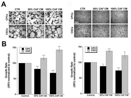 3.1. CAF Conditioned Medium (CM) Reduces CPC Growth and Increases CSC Growth on All of the Substrates