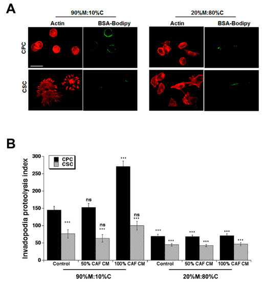 3.2. Effect of Primary CAF Conditioned Medium (CM) on CPC and CSC Invadopodia Proteolytic Activity