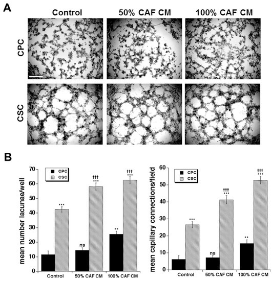 3.3. Effect of Primary CAF Conditioned Medium (CM) on CPC and CSC Vasculogenic Mimicry