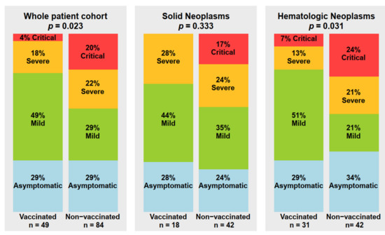 Patients with hematologic malignancies had a clear benefit from vaccination: 51% (n = 16/31) and 21% (n = 9/42) had a mild, 13% (n = 4/31) and 21% a severe (n = 9/42), and 7% (n = 2/31) and 24% (n = 10/42) a critical course among vaccinated and non-vaccinated cases (p = 0.031), accordingly. Similarly, among patients with solid tumors, there were more mild courses (44% vs. 35%) and no critical courses (0% vs. 17%) in vaccinated vs. non-vaccinated patients, but the differences did not reach significance (Figure 2). In the groups of vaccinated patients, those with hematologic malignancies fared significantly worse than those with solid tumors. Seven percent of them (n = 2/31) and none with a solid tumor had a critical COVID-19 course (Figure 2).