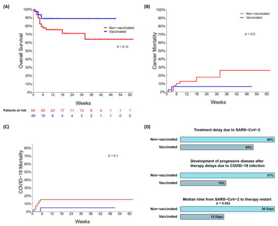 (A) Overall survival among non- and vaccinated patients; (B) cancer mortality among non- and vaccinated patients; (C) COVID-19 mortality among non- and vaccinated patients; (D) treatment delay, development of progressive disease, and median time from SARS-CoV-2 infection to therapy restart among non- and vaccinated patients of this study.