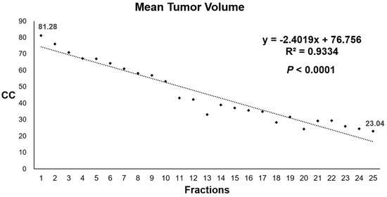 At baseline, mean tumor volume was 81.28 ± 48.77 cc. The significant regression of tumor volume (p < 0.0001) was observed as early as 4th fraction (mean 67.33 ± 40.55 cc) after three sessions of treatment. By the end of treatment, tumor volume was reduced to mean 23.04 ± 10.79 cc. The data of daily tumor volumetry for all patients are shown in Supplementary Table S1.