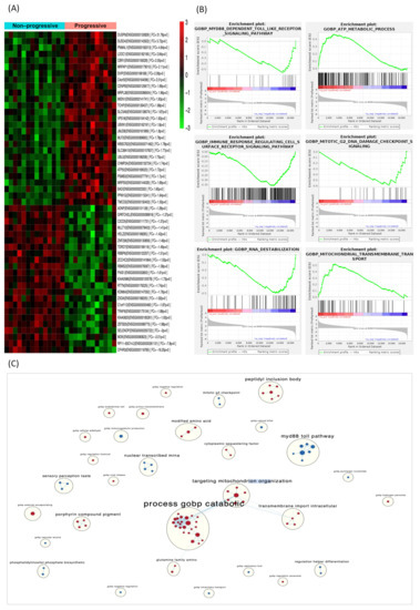 Overall, we identified 1380 transcripts that were differentially expressed (p < 0.05) between progressive and non-progressive ccRCC samples. Of these, 639 were protein-coding genes; 217 were downregulated and 422 upregulated in progressive compared with non-progressive cases. A heat map based on the most DEGs between the two groups of ccRCC patients is shown in Figure 2A. Gene set enrichment analysis (GSEA) identified several enriched biological processes, such as the dependent toll-like receptor signaling pathway, metabolic process and immune response regulating cell surface receptor signaling pathway (Figure 2B). The full list of GO biological processes is available in Supplementary Materials (Table S2). To aid interpretation of these enriched pathways, we used enrichment maps to create a network-based representation of our results. The most prominent cluster of significantly enriched pathways recapitulated changes in the Catabolism Biological Process and Toll Signaling Pathway (Figure 2C).