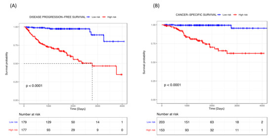 Kaplan–Meier curves of the combined gene expression-based model for (A) disease progression-free survival and (B) cancer-specific survival for TCGA cohort.