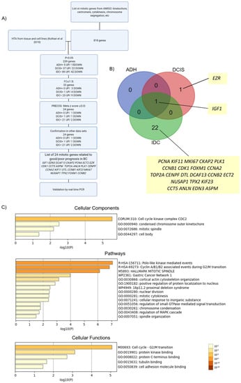 Enrichment analysis of mitotically relevant genes. (A) Flowchart of study design. HTA: human transcriptome array. p: p value. FC: fold change. PRECOG: Prediction of Clinical Outcomes from Genomic Profiles. (B) Venn diagram showing the 24 differentially expressed genes in each subgroup of BC progression compared to normal breast lesions. (C) Enrichment analysis of differentially expressed genes (DEGs) in BC using Metascape. Bar graph of enriched terms across input gene list, colored by p-values.