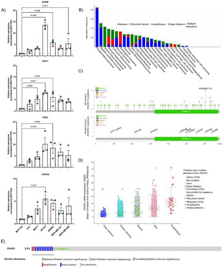 To further explore the significance of CKAP2 in BC, aberrations of the CKAP2 gene were initially explored in TCGA using cBioPortal (Figure 2B). The results show that while prostate adenocarcinoma presented the highest percentage of mutations in CKAP2 (in approximately 8% of patients), approximately 2.2% of the patients with invasive BC presented mutations in CKAP2. The pan-cancer analysis indicated 104 alterations in CKAP2 protein observed in patient samples and localized throughout the protein (Figure 2C). The most common alteration was missense mutations (82 patients), followed by truncating, splicing errors, and structural variants/fusion present in seventeen, three, and two patients, respectively. Nine mutations were found in BC patients, including seven, one, and one missense, truncating, and splice variant mutations, respectively. Strikingly, most of these alterations in BC (six of nine) were found on the C terminal (CKAP2_C) domain of the protein (Figure 2C), representing the most conserved and functionally relevant region of this protein [44,45,46,47]. The pan-cancer analysis showed that the level of mRNA correlated with copy number alterations (Figure 2D), with the average expression for amplification and deep deletion presenting the highest and lowest levels of CKAP2, respectively. Moreover, the oncoprint showed that most alterations were missense mutations and deep deletions, although gene amplifications were also detected in BC (Figure 2E). These data taken together show the clinical relevance of CKAP2 mutations in human cancers with the CKAP2_C domain a particular hotspot in BC.
