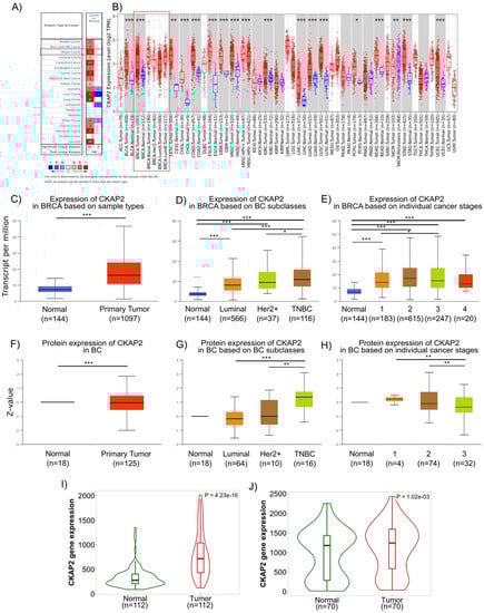 Human CKAP2 expression levels in different tumor types determined using Oncomine, Tumor Immune Estimation Resource (TIMER2.0), UALCAN (University of Alabama at Birmingham Cancer data analysis Portal), and TNMPLOT. (A) mRNA expression levels of CKAP2 in 20 cancer types from Oncomine. Numbers in red and blue cells represent dataset numbers in which levels of CKAP2 are statistically increased or decreased, respectively (p < 0.05, a fold-change > 1.5, and gene rank top 10%). (B) CKAP2 expression in different cancers was analyzed by TIMER2.0. (* p < 0.05; ** p < 0.01; *** p < 0.001). (C–E) mRNA expression of CKAP2 in BC from UALCAN. Boxplots showing CKAP2 mRNA levels in healthy controls versus individuals with BC (C), BC subclasses (D), and based on BC stages (E) (* p < 0.05; *** p < 0.001). (F–H) CKAP2 protein expression analysis using data from Clinical Proteomic Tumor Analysis Consortium (CPTAC). Boxplots showing CKAP2 protein levels in healthy controls versus individuals with BC (F), BC subclasses (G), and based on BC stages (H). (** p < 0.01; *** p < 0.001). (I,J) CKAP2 expression from paired tumor and adjacent normal tissues using TNMPLOT. (I) Violin plot showing CKAP2 expression from RNA-seq data. (J) Violin plot showing CKAP2 expression from gene chip data. BC: breast cancer; HER2+: human epidermal growth factor receptor 2 positive; TNBC: triple negative breast cancer. Data with p < 0.05 were considered statistically significant.