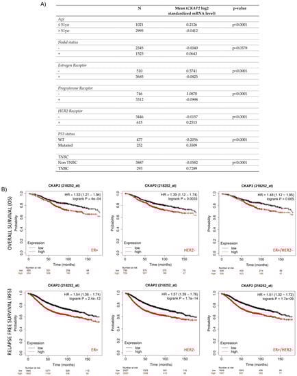 To compare the transcription levels of CKAP2 between different groups of patients based on different clinicopathological indicators, and to determine the prognostic potential of CKAP2, the bc-GenExMiner 4.2 database was used (Figure 4A). This analysis revealed that CKAP2 expression was higher in patients ≤51 years old when compared to patients >51 years old (p < 0.0001). Moreover, CKAP2 expression was higher when nodal status was “positive” compared to when it was “negative” (p = 0.0378). Considering the ER and PR status, CKAP2 expression was found to be higher when receptor was negative compared to when it was positive (ER −> ER+, p < 0.00001; PR −> PR+, p < 0.00001). Furthermore, CKAP2 expression was higher in HER2+ when compared to HER2− (p < 0.0001). Additionally, CKAP2 expression was higher when p53 was mutated compared to non-mutated (p < 0.0001). Lastly, CKAP2 was highly expressed in TNBC compared to non-TNBC patients (p < 0.0001. These results suggest that CKAP2 expression serves as a potential diagnostic indicator in BC, and that it may correlate with more severe disease.