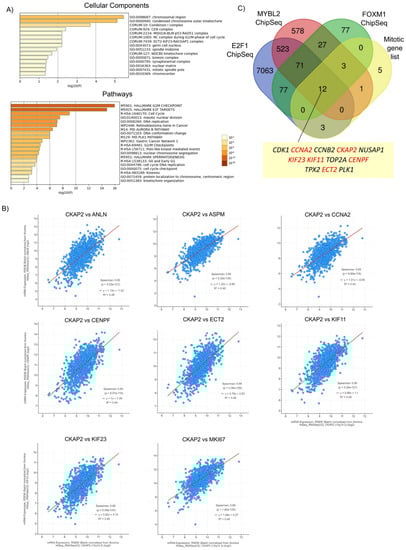 Highly correlated genes (Spearman’s correlation r ≥ 0.5) co-expressed with CKAP2 in TCGA-BRCA cohort. (A) Bar graph of enriched terms across input gene list, colored by p-values, using Metascape. Upper graph: cellular components. Lower graph: pathways. (B) Correlation between CKAP2 and 8 selected genes from the top 30 highly correlated genes (r ≥ 0.5), which are also present in the list of 24 mitotically relevant genes. (C) Venn diagram showing the overlap of ChIP-seq datasets for E2F1, MYB2L, and FOXM1 with the list of 24 mitotic genes. This analysis showed that all transcription factors collectively bind to the promoters of 12 mitotic genes (including CKAP2). Eleven genes were highly co-expressed with CKAP2 and upregulated in IDC (highlighted in red). Data with p < 0.05 were considered statistically significant. p-value (p).