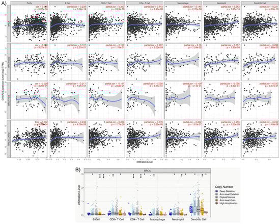 Correlation among gene expression, somatic copy number alterations (CNA), and immune infiltration was calculated in BC using Tumor Immune Estimation Resource (TIMER) 2.0 [34]. For gene expression, the Wilcoxon test was computed. For immune infiltration, purity adjustment was selected using Spearman’s correlation. Results were considered statistically significant when p-value < 0.05.