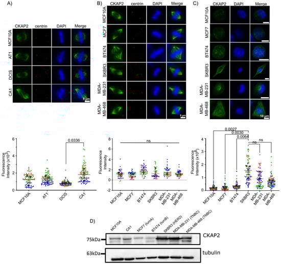 In order to determine whether CKAP2 overexpression in invasive BC can be recapitulated in another continuous model of BC, we took advantage of the MCF10A breast cancer cell line series, a powerful cell culture model system for studying BC evolution [54]. This system consists of multiple lines derived from an immortalized mammary epithelial cell line, MCF10A, propagated through sequential transplantation in mice to generate a BC continuum that mimics the way in vivo human breast lesions reflect BC progression. In this manner, these “isogenic” cell lines MCF10A, MCF10AT1, MCF10ADCIS.com and MCF10CA1a phenocopy normal, premalignant epithelium (atypical ductal hyperplasia), ductal carcinoma in situ, and high-grade invasive lesions, respectively [21,22,23,24]. To examine the levels of CKAP2, we quantified the intensity of CKAP2 levels at the spindle of mitotic cells using immunofluorescence in the MCF10A series (Figure 7A). In agreement with the HTA dataset and analysis and of publicly available BC data, our observations in the MCF10A continuum demonstrated an increase in CKAP2 levels in CA1. Additionally, data from the Human Protein Atlas (Figure S4) showed that CKAP2 staining was present in mitotic cells from IDC patients.
