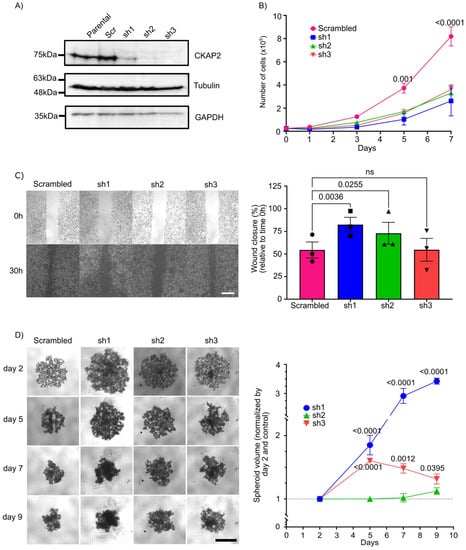Effect of CKAP2 knockdown in breast cancer. (A) Immunoblot showing CKAP2 protein levels in parental SKBR3 cells and SKBR3 cells that stably express a scrambled vector (control) and three different shRNAs (sh1, sh2, and sh3). Tubulin and GAPDH: loading control. (B) Growth curve of CKAP2 cell lines (scrambled, sh1, sh2, and sh3). Data are shown as mean ± SEM. p < 0.05 were considered statistically significant. n = 3 biological replicates. (C) Cell migration (wound healing) assay in CKAP2 cell lines (scrambled, sh1, sh2, ad sh3) using IBIDI inserts. Representative images are shown from three independent experiments. Graphs show the percentage of wound closure ± SEM normalized relative to time 0. (D) 3D spheroid formation assay in CKAP2 cell lines (scrambled, sh1, sh2, ad sh3). Representative images are shown from three independent experiments. Graph shows the spheroid volume ± SEM normalized by control at day 2. All statistical tests of comparative data were performed using one-way (B,C) or two-way (D) ANOVA for differential comparison between more than two groups. Data with p < 0.05 were considered statistically significant. Scale bar: 500 µm.