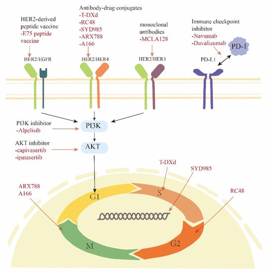 Anti-HER2 agents are gaining traction in the treatment of HER2-low BC, indicating HER2 expression as a possible therapeutic breakthrough. In terms of the drug effect mechanism, therapies related to HER2 can be divided into those targeting HER2 receptors on the cell surface, those targeting HER2-related intracellular signaling pathways and those targeting the immune microenvironment, as shown in Figure 1.