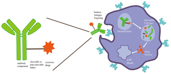 An ADC consists of an antibody against a target antigen, cytotoxic drugs (payload) and cleavable or non-cleavable linkers [42] (Figure 2). ADCs exert cytocidal effects through targeting of surface antigens, internalization, enzymatic cleavage and drug release [43], resulting in high target selectivity and potent lethality in chemotherapy.