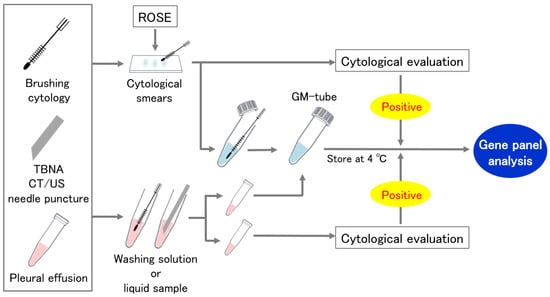 Cytological specimens were collected by two alternative procedures (Figure 1). In the first method, we divided the specimens between cytological smears and a GM tube for panel analysis. Cytological smears were assessed for ROSE or routine cytological evaluation for the confirmation of malignant cells. The second method divided the washing solution or liquid sample evenly into two containers, one into the GM tube and the other into the cytological evaluation. If no malignant cells were found in the paired cytological specimens, the sample was excluded from the analysis.