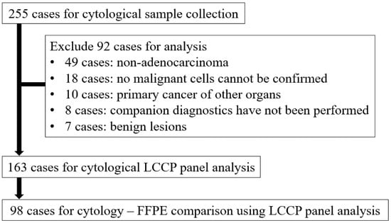 The total number of cases during the enrollment period was 255, of which 92 were excluded from the analysis for the following reasons: 49 cases for non-adenocarcinoma lung cancer, 18 cases for which no malignant cells could be confirmed in paired cytological specimens, 10 cases for primary cancer of other organs, 8 cases for which companion diagnostics were not performed, and 7 cases for benign lesions. As a result, 163 cytological samples and 98 FFPE samples were analyzed by LCCP (Figure 2).