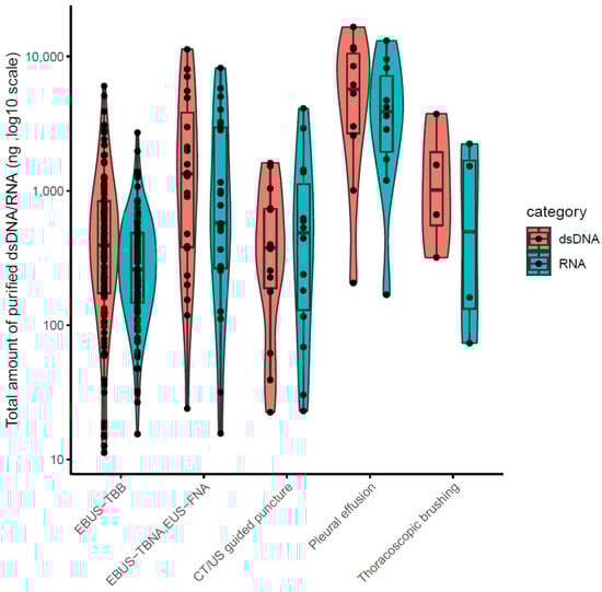 In this study, sufficient and high-quality nucleic acid yields were obtained regardless of the test method. However, the fact that the yield of RNA is slightly lower than that of DNA or the RIN value is lower than that of DIN is presumed to be due to the rapid degradation of RNA [20,21]. In particular, the high nucleic acid yield of pleural effusion is presumed to be due to the contamination of various cells other than cancer cells, but it is a fact that the quality of nucleic acid is also extremely high [22,23].