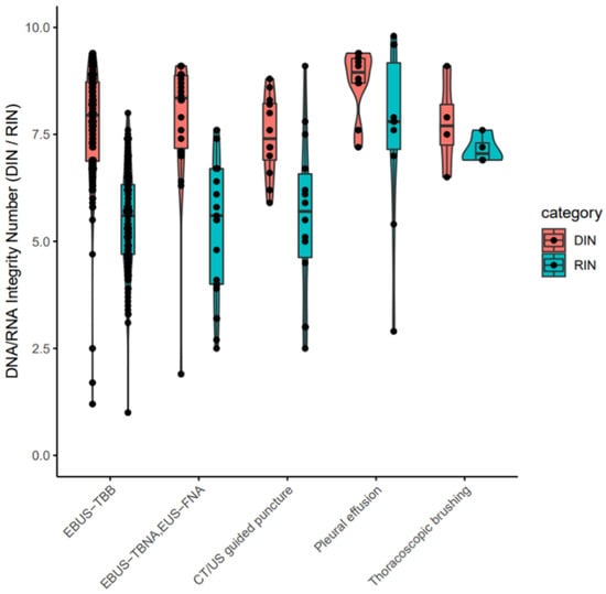 Figure 4. DIN/RIN values for purified nucleotides from cytology samples. EBUS-TBB: Endobronchial ultrasonography-guided transbronchial brushing. EBUS-TBNA: Endobronchial ultrasonography-guided transbronchial needle aspiration. EUS-FNA: Endoscopic ultrasound-guided fine needle aspiration. CT: Computed tomography. US: ultrasound. EBUS-TBB: Endobronchial ultrasonography-guided transbronchial brushing. EBUS-TBNA: Endobronchial ultrasonography-guided transbronchial needle aspiration. EUS-FNA: Endoscopic ultrasound-guided fine needle aspiration. CT: Computed tomography. US: Ultrasound.