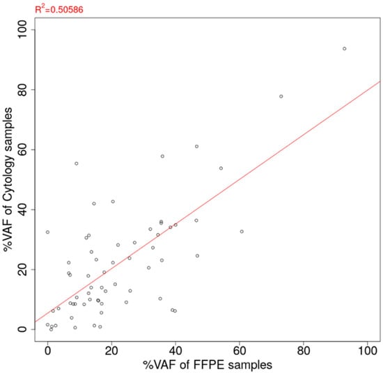 Figure 5. Correlation of estimated %VAF between FFPE tissue sample and cytology sample. VAF: Variant allele frequency. FFPE: Formalin-fixed paraffin-embedded.