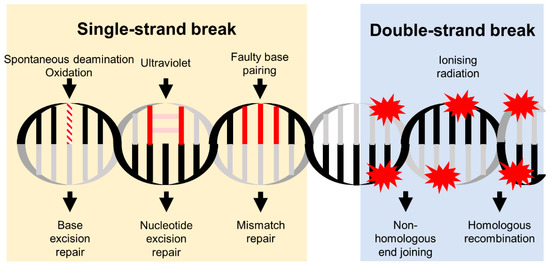 The DDR consists of a myriad of events triggered through multiple pathways to minimize the potentially catastrophic effects of DNA lesions [4]. Given the vital role of DNA in living cells as well as its susceptibility to various sources of damage due to its large intricate structure, the protective mechanisms required to ensure genome stability are unsurprisingly complex and involve interactions between different processes. If the DNA damage encountered is deemed irreversible, the DDR ultimately results in cell death, preventing mutagenic effects such as tumorigenesis [5]. Conversely, sublethal DNA damage can be reversed via the DDR, with the mechanisms divided into the single-strand break (SSB) and double-strand break (DSB) repair, as determined by the extent of sustained lesions (Figure 1).