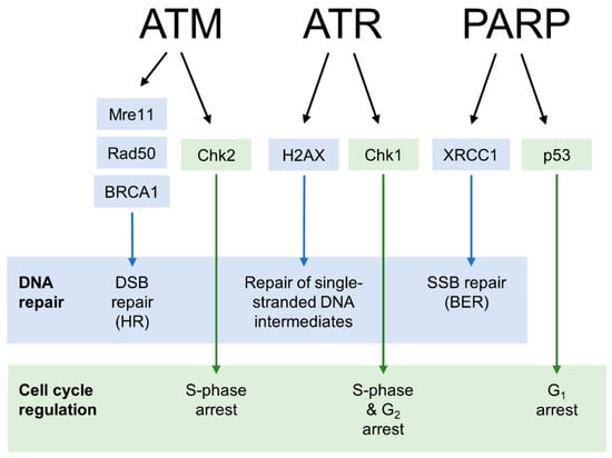 Main substrates of ATM, ATR, and PARP in the DDR. Activation of downstream proteins by the three signal transducers is required for various DNA repair and cell cycle regulation pathways.