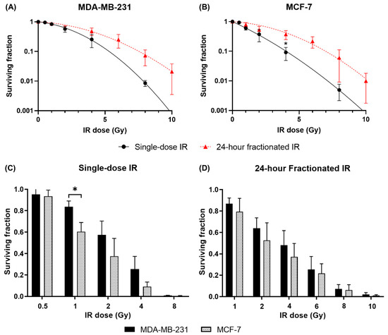 IR dose fractionation leads to decreased lethality, and MCF-7 cells are more radiosensitive than MDA-MB-231 cells. Clonogenic assays were performed to quantify cell survival after treatment with either a single-dose IR or 24-h fractionated IR at total doses of 0.5 to 10 Gy. Surviving fractions of (A) MDA-MB-231 and (B) MCF-7 cells were fitted to graphs using the linear-quadratic model. The effects of (C) single-dose and (D) 24-h fractionated IR on the cell lines were then compared. Data are shown as mean ± SD of three independent experiments performed in duplicate or triplicate wells. * p < 0.05 difference between single-dose and fractionated survival.