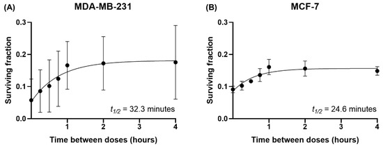 The effect of IR dose fractionation was further investigated by evaluating SLD repair in irradiated MDA-MB-231 and MCF-7 cells. Two IR doses of 3 Gy were administered, separated by 0 to 4 h, and clonogenic assays were then used to determine cell survival. Both cell lines demonstrated higher survival as the interval between IR doses increased. Their SLD repair kinetics were similar, as indicated by their comparable repair half-times of approximately half an hour (Figure 4).
