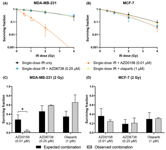 To establish whether the induced radiosensitization was due to additive or synergistic effects, observed surviving fractions were compared to expected surviving fractions after single-dose IR and DDR inhibitor combination treatments. The expected surviving fractions from each combination treatment were calculated by multiplying the observed surviving fractions after IR-only and drug-only treatments, assuming that their combined effects were solely additive. Comparisons were conducted using 2 Gy single-dose IR to maintain clinical relevance. AZD0156 led to lower-than-expected surviving fractions in both cell lines, although statistical significance was only achieved in MDA-MB-231 cells (p = 0.0146, Figure 5C,D).