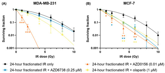 Combinations of 24-h fractionated IR and DDR inhibitors were then investigated. MDA-MB-231 and MCF-7 cells were treated with AZD0156 (0.01 µM), AZD6738 (0.25 µM) or olaparib (1 µM) one hour prior to the initial irradiation, and the second IR dose was delivered 24 h later. Total IR doses of 1 to 8 Gy were administered, and post-treatment cell survival was quantified with clonogenic assays. The most profound radiosensitization was again observed with the use of AZD0156 in MDA-MB-231 cells, as no colonies formed at a total IR dose of 4 Gy. However, unlike for single-dose exposures, both olaparib and AZD6738 also showed significant radiosensitization when fractionated exposures were delivered (Figure 6A). Similarly, for MCF-7 cells, all three DDR inhibitors increased sensitivity to 24-h fractionated IR where no effects were seen for single doses (Figure 6B).