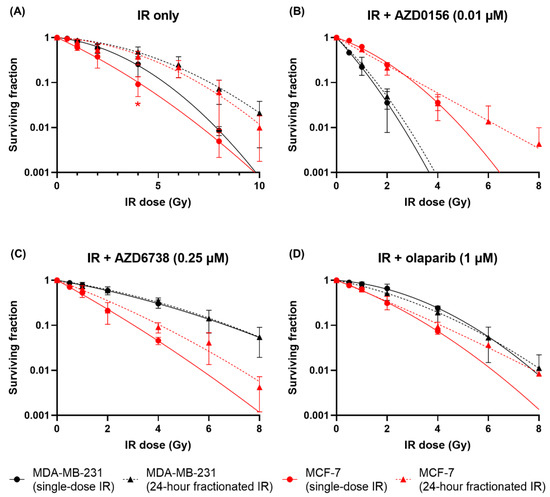 The radiosensitizing capability of AZD0156 (0.01 µM), AZD6738 (0.25 µM) and olaparib (1 µM) was initially evaluated through their combined use with single-dose IR. MDA-MB-231 and MCF-7 cells were treated with each drug an hour before single-dose irradiation at 0.5 to 4 Gy, and clonogenic assays were performed to assess cell survival. The only DDR inhibitor which induced significant radiosensitization in these conditions was AZD0156. This enhancement of single-dose IR cytotoxicity was observed at all IR doses in MDA-MB-231 cells, whereas in MCF-7 cells, it reached significance only at 4 Gy. On the other hand, AZD6738 and olaparib did not lead to significant radiosensitization in either cell line (Figure 5A,B).