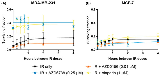 To determine if DDR inhibition affects SLD repair, MDA-MB-231 and MCF-7 cells were first treated with AZD0156 (0.01 µM), AZD6738 (0.25 µM) or olaparib (1 µM). They were irradiated an hour later with two IR doses separated by 0 to 4 h. Doses were selected to give similar levels of survival to two fractions of 3 Gy IR alone (Figure 4). A total IR dose of 3 Gy was selected for all treatment groups other than MDA-MB-231 cells treated with AZD0156, whose greater sensitivity required a lower total dose of 2 Gy. Clonogenic assays were performed to assess cell survival, and the surviving fractions were graphed using the one-phase exponential model. As the interval between IR doses increased, survival of MDA-MB-231 cells treated with AZD0156 or olaparib showed a slight increase before plateauing at approximately the 2-h timepoint; cells treated with AZD6738, however, did not show changes in survival with time (Figure 8A). On the other hand, MCF-7 cells demonstrated increasing survival regardless of the DDR inhibitors used, although this trend was less noticeable after treatment with AZD6738 (Figure 8B).