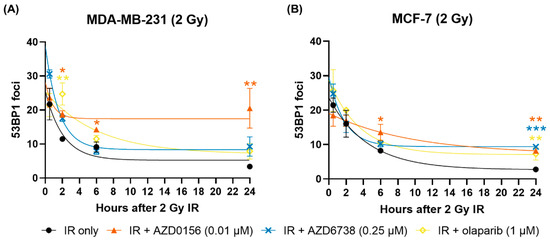 Immunofluorescence experiments were conducted to evaluate the influence of AZD0156 (0.01 µM), AZD6738 (0.25 µM) and olaparib (1 µM) on the formation and resolution of DNA damage, using 53BP1 foci as markers of DNA DSBs. When cells were irradiated with 2 Gy, all treatment groups except for MDA-MB-231 cells treated with IR and olaparib demonstrated most foci 30-min post-IR, gradually decreasing over time. Notably, all DDR inhibitors delayed foci resolution in both cell lines, subsequently leading to more residual foci compared to IR-only treatment at 24-h post-IR. In MDA-MB-231 cells, this retardation was most prominent with AZD0156, whereas in MCF-7 cells, it was comparable across the three drugs (Figure 9).