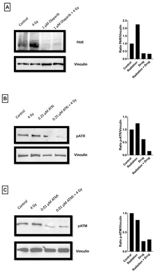 An hour before irradiation with 4 Gy, cells were treated with 0.1 µM AZD0156, 0.25 µM AZD6738 or 1 µM olaparib. Control cells were treated with DMSO. Then, cells were harvested 30 min after irradiation, and proteins were extracted with a radioimmunoprecipitation assay buffer. Then, 50 μg of protein sample was loaded onto a 6% SDS-PAGE or 8% SDS-PAGE gel, and after electrophoresis, proteins were blotted on a nitrocellulose membrane (Life Technologies, Carlsbad, CA, USA). The membranes were blocked with 3% bovine serum albumin (BSA) in Tris-buffered saline (TBS)-Tween (0.1% Tween-20 in TBS) and incubated overnight at 4 °C with primary antibodies (PAR(ab-1) (Milipore), pATR #2853, pATM #13050 (Cell Signaling, Danvers, MA, USA) at a dilution of 1:1000 in 3% BSA in PBS-Tween. The anti-Vinculin #13901 (Cell Signaling, USA) antibodies were used as housekeeping controls at a dilution of 1:1000. After washing with TBS-Tween, membranes were incubated in their secondary anti-rabbit and anti-mouse horseradish peroxidase-conjugated antibodies diluted at 1:2000 at room temperature for one hour. The membranes were then washed and developed with Luminata Crescedo Western HRP subtract (Millipore, Burlington, MA, USA) using the GBox Imager by Syngene (Cambridge, UK). Band density quantification was performed using the ImageJ software. Protein ratios were normalized to the untreated control cells.