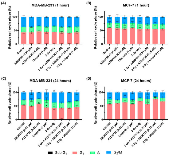 To evaluate the cell cycle distribution of MDA-MB-231 and MCF-7 cells treated with 2 Gy IR, a DDR inhibitor or combinations of both, cell cycle analysis was conducted using flow cytometry at 1 and 24 h after the indicated treatments. After an hour, no changes were observed across all treatment groups in both cell lines (Figure 11A,B). At 24 h in MDA-MB-231 cells, 2 Gy IR increased G2/M arrest slightly, whereas treatment with only AZD6738 or olaparib influenced G1 arrest, leading to an increase and decrease, respectively (Figure 11C). As for MCF-7 cells, there were no alterations whatsoever akin to the previous time point (Figure 11D).