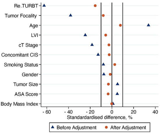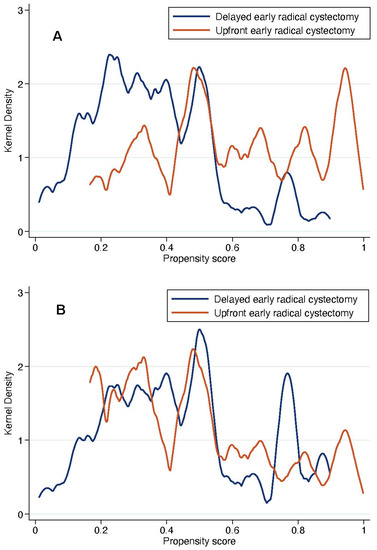 19]. A standardized difference of <10% indicated no significant difference between the patients who underwent upfront or delayed eRC. In addition, kernel density plots were used to compare propensity score distribution between the two treatment groups. Finally, IPTW-adjusted Kaplan–Meier curves were computed to compare RFS, CSS and OS between patients who received upfront vs. delayed eRC [