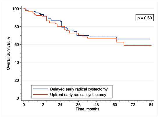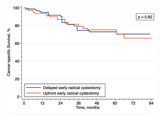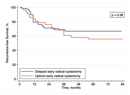 Patients who underwent eRC without receiving any intravesical instillation of BCG before surgery were included in the upfront eRC group, while those who received at least an induction course with six intravesical instillations of BCG before surgery were included in the delayed eRC group.