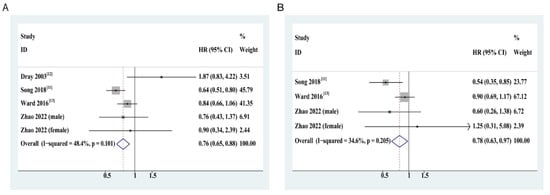 We observed a significantly negative correlation between dietary fiber intake and all-cause mortality among CRC survivors. The pooled HRs and 95% CI of all-cause mortality when comparing persons in the top category of dietary fiber intake with those in the bottom category was 0.76 (95% CI: 0.65–0.88) (Figure 2A). The funnel plot was symmetrical with one small study outlier (Figure S1). Both Begg’s (p = 0.46) and Egger’s (p = 0.29) tests were non-significant (Figure S2). The heterogeneity detected among studies was medium and not statistically significant (I2 = 48.4%; p = 0.101).