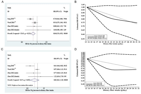 In the dose–response meta-analysis, there was no evidence of nonlinearity in the relationship between dietary fiber intake and all-cause mortality with no sign of a plateau within the available data (p nonlinearity = 0.32) (Figure 3B). The risk of all-cause mortality among CRC patients decreased by 16% for each 10 g/day increase in dietary fiber intake (HR: 0.84, 95% CI: 0.76–0.92); the heterogeneity was not evident (I2 = 33.4%, p = 0.212) (Figure 3A).