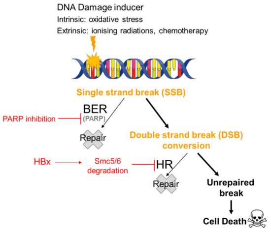Synthetic lethality of PARP inhibitors in HBV-infected cells. It has been hypothesized that in a patient infected with HBV treated with PARP inhibitors, SSBs generated either intrinsically by oxidative stress or extrinsically by chemotherapy or radiotherapy remain unrepaired and are converted to DSBs. The impact of the degradation of the Smc5/6 complex by HBx on the HR pathway would result in the persistence of these DSBs and cell death.