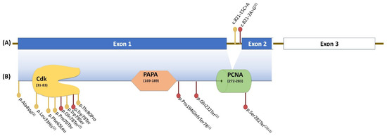 Variants identified along the CDKN1C gene, organised in three exons (A). Exons 1 and 2 encode the functional protein (B), which is organised into three domains: the cyclin-dependent kinase-inhibitor domain (CdK), the proline–alanine repeats domain (PAPA), and the proliferating cell nuclear antigen domain (PCNA). (1) Variants reported by Kantaputra et al. (2013) [24]; (2) Variants reported by Romanelli et al. (2010) [23]; (2)(X3) Variants reported by Romanelli et al. (2010) that were observed in three different cases. Red dots, loss-of-function variants; yellow dots, missense variants.