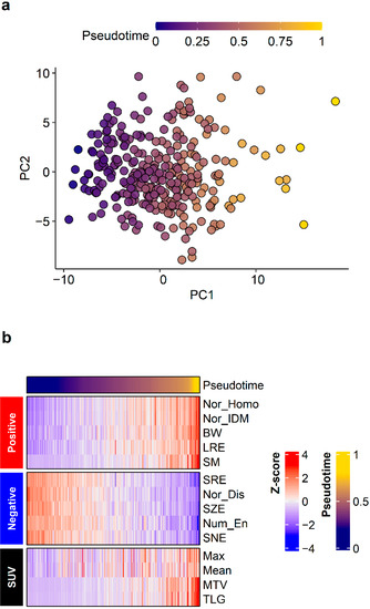 Pseudotime analysis results. Pseudotime of primary tumors was successfully estimated in the radiomics dataset. (a) A principal components analysis plot visualized the order of pseudotime in each FDG PET/CT image. Although there was no clustering, pseudotime was estimated according to a specific direction and not randomly. (b) The top 10 features demonstrating positive correlations and top 10 features demonstrating negative correlations with pseudotime are shown. Conventional image parameters based on SUV are also shown.