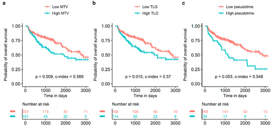 Survival curves according to MTV, TLG, and pseudotime. MTV (a), TLG (b), and pseudotime (c) of the primary tumor were significant prognostic factors for overall survival.