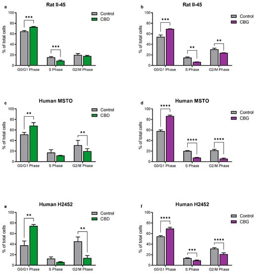 The phytocannabinoids cannabidiol (CBD) and cannabigerol (CBG) induce cell cycle arrest in mesothelioma cell lines. The effects of CBD and CBG (2xIC50) on cell cycle were assessed in rat II-45 (a,b), human MSTO (c,d) and H2452 (e,f) mesothelioma cell lines. After 24 h of treatment with vehicle (control), CBD or CBG, cells were harvested, and assays performed. Bars show the mean and SD from three independent experiments. p-values were calculated using two-way ANOVA Holm-Sidak’s multiple comparisons. ** p < 0.01, *** p < 0.001, and **** p < 0.0001 relative to vehicle-treated control cells.