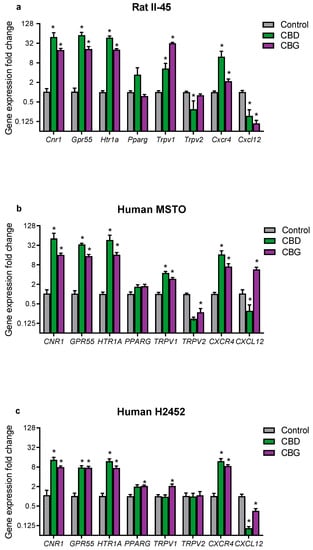 The phytocannabinoids cannabidiol (CBD) and cannabigerol (CBG) affected mRNA expression of cannabinoid and mesothelioma-related targets in cultured mesothelioma cells. Gene expression was quantified by RT-qPCR in (a) rat II-45 and human (b) MSTO and (c) H2452 mesothelioma cells. FC in gene expression was calculated relative to untreated control cells using the 2-delta-delta Ct method after normalizing to TBP. Bars show the means and SD in gene expression relative to control (n = 3). Grey bars represent a fold change (FC) of one in control treated cells. p-values were calculated using two-way ANOVA Holm–Sidak’s multiple comparisons. * p < 0.01 relative to vehicle treated control cells and FC < 0.5 or >2.