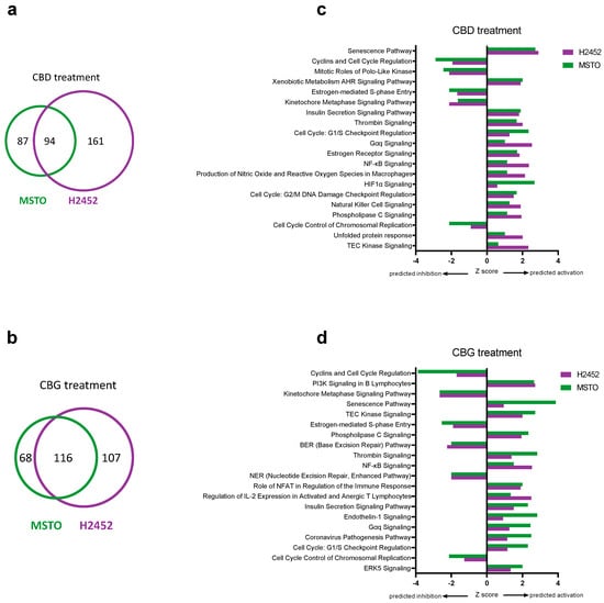 Differentially expressed genes and pathway analysis associated with cannabidiol (CBD) and cannabigerol (CBG) treatment. The number of genes found to be differentially expressed (a,b) and top shared canonical pathways (c,d) as a result of CBD (a,c) and CBG (b,d) treatment in human MSTO and H2452 mesothelioma cell lines. Analysis was performed relative to vehicle treated control cells and only includes genes with FC > 2. Overlapping areas in Venn diagrams (a,b) indicate the number of shared genes found to be differentially expressed in the same direction in both cell lines. Z-scores (c,d) indicate predicted activation state of the top significantly enriched canonical pathways with values < 0 indicating inhibition and values > 0 indicating activation.