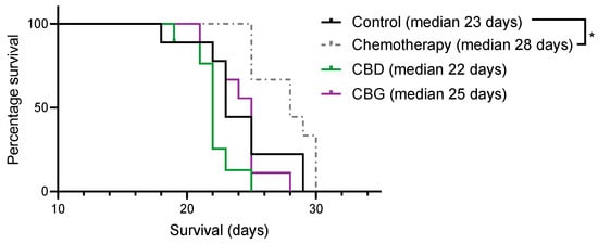 A syngeneic orthotopic rat mesothelioma model [39] was used to assess whether daily treatment for 4 weeks with 40 mg/kg CBD or 100 mg/kg CBG i.p. compared to standard of care chemotherapy (1 mg/kg cisplatin + 6.7 mg/kg pemetrexed) improved survival (Figure 7). Although survival was the primary endpoint of this study, severity of pleural dissemination at endpoint was also assessed. No statistical differences were observed between the groups (data not shown). As expected, treatment with cisplatin + pemetrexed significantly prolonged survival compared to vehicle-treated animals (median survival 28 days vs. 23 days, respectively; p < 0.05), however neither CBD nor CBG prolonged survival.