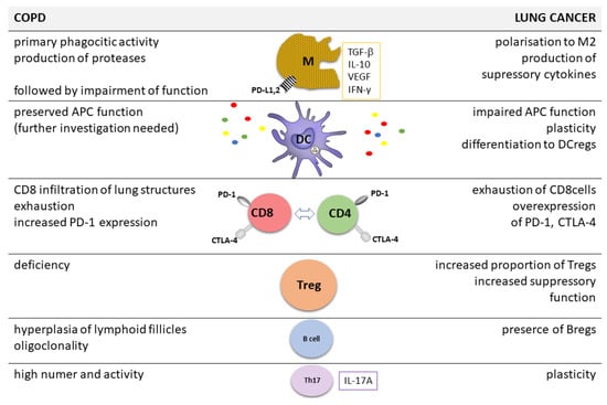 There are some immune pathways that overlap between the influence of tobacco smoke, COPD and lung cancer, while the others are different. Thus, the question arises—what is common, what immune mechanisms are responsible for supporting lung cancer development in the course of COPD? The role of immunity in the development of both diseases was supported by the study of Kachuri et al., in which the genetic background of a risk of lung cancer connected with airflow limitation concerned mainly immune-related pathways [30].